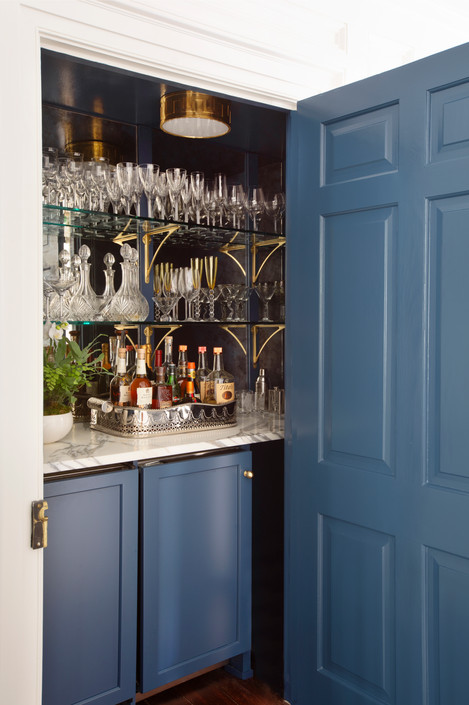 The kitchen’s original structure was left untouched, but received new cabinetry, finishes, and fixtures to elevate it in elegance, as well as function. It connects to the central family space of the home via a butler’s pantry, which was saturated in color and a stunning mural wallpaper. A fun surprise within the dining room lies behind a closet door, where a vibrant bar is hidden.